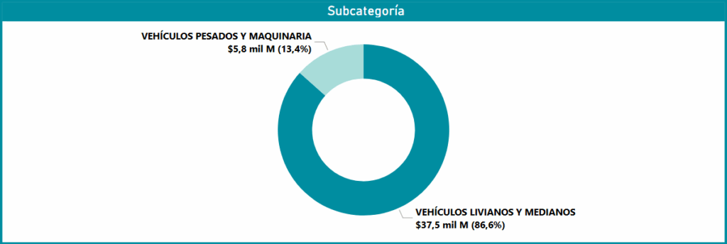 Tras el análisis de la evolución temporal de las transacciones, esta nueva data nos permite consolidar el volumen total de negocios generados por el Convenio Marco de Vehículos, el cual asciende a $43,3 mil millones. La distribución de este monto total se realiza primariamente en dos subcategorías: Vehículos Livianos y Medianos, y Vehículos Pesados y Maquinaria. Esta consolidación de $43,3 mil millones ratifica el impacto significativo del convenio en las compras públicas y contextualiza la alta variabilidad mensual previamente observada, la cual corresponde a la ejecución progresiva de este elevado presupuesto.