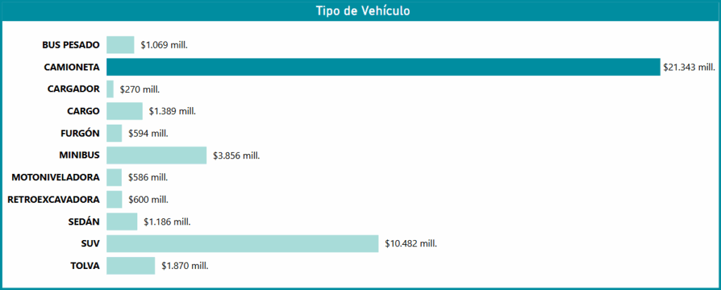 El desglose por tipo de vehículo valida y profundiza la conclusión anterior respecto a la dominancia de la subcategoría de Vehículos Livianos y Medianos. En términos absolutos, el tipo de vehículo Camioneta emerge como el principal motor del convenio, alcanzando un volumen de $21.343 millones, lo que por sí solo representa casi la mitad del monto total transado (aproximadamente el 49,3%). Este dato sugiere que las camionetas son el estándar preferido para las flotas operativas y logísticas de las entidades públicas, dada su versatilidad y capacidad de carga.