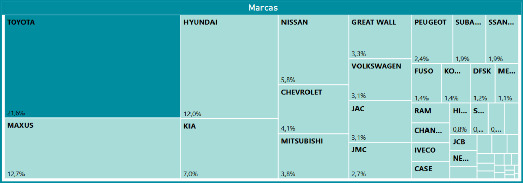 A pesar del liderazgo concentrado, el restante 53,7% del mercado se distribuye entre un amplio espectro de proveedores, lo que garantiza la diversificación y la competencia. Marcas como KIA (7,0%), Nissan (5,8%) y Chevrolet (4,1%) conforman un sólido segundo nivel, ofreciendo alternativas en el segmento mediano. Es notable la significativa irrupción de marcas de origen chino, como Great Wall (3,3%), JAC (3,1%) y Maxus (12,7%), las cuales en conjunto aseguran una variedad de ofertas de menor costo y más especializadas, que complementan a las marcas tradicionales. Esta distribución indica que, si bien las entidades públicas tienen preferencias claras, el convenio es lo suficientemente amplio para soportar una base de proveedores competitiva.