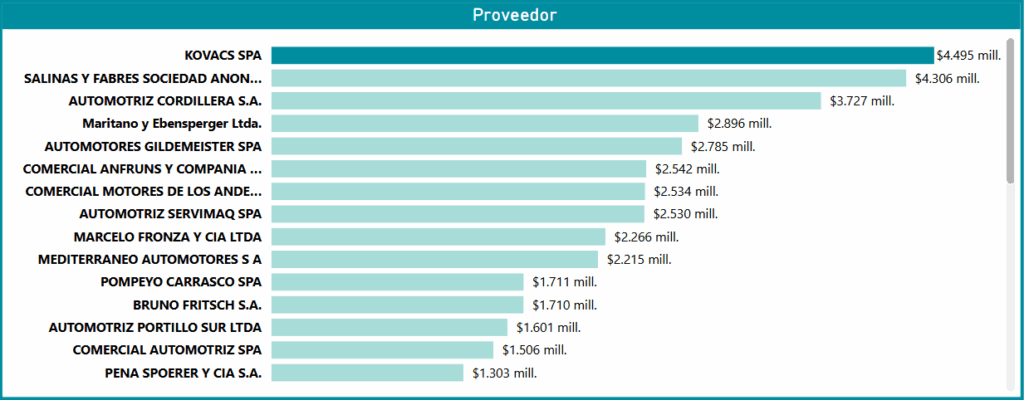 La participación de 36 proveedores en total es un indicador clave de la robustez del Convenio, a pesar de que los volúmenes transados en el nivel inferior sean menores. Empresas como Maritano y Ebensperger Ltda. ($2.896 mill.) y Automotores Gildemeister SPA ($2.785 mill.) se consolidan en un segundo nivel que, junto a los más de 30 participantes restantes, asegura una alta competitividad y una amplia cobertura para las necesidades más específicas. Esta fragmentación en el resto de la tabla permite que el Convenio pueda satisfacer eficientemente la demanda no solo de vehículos livianos, sino también de los segmentos de menor volumen, como la maquinaria pesada, garantizando así la capacidad de respuesta a todo el espectro de la demanda pública.