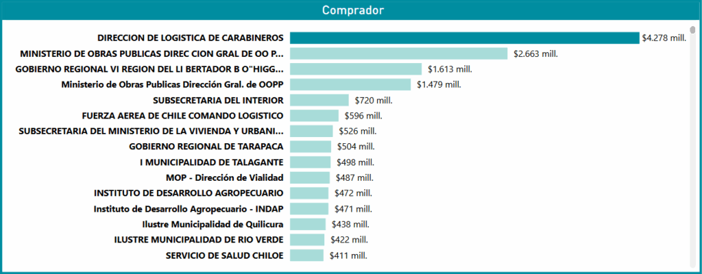 El hecho de que existan 436 entidades compradoras en total destaca la naturaleza transversal del convenio, trascendiendo las necesidades de seguridad y obras públicas. Más allá de los principales ministerios, la demanda se fragmenta en Gobiernos Regionales (como O’Higgins y Tarapacá), municipalidades (como Talagante y Quilicura), y organismos especializados (como INDAP y Servicios de Salud). Esta dispersión en la base de compradores asegura que el Convenio no solo atienda los pedidos masivos de la cúpula estatal, sino que también provea de manera eficiente vehículos y maquinaria a las 436 instituciones, desde las grandes reparticiones centrales hasta los niveles más descentralizados de la administración pública.