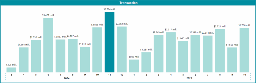 Al observar la secuencia completa de los 18 meses, se identifica que el volumen de transacciones se mantiene en un rango saludable hacia el final del periodo analizado, con cifras en torno a los $2.796 millones en octubre de 2025. Si bien el peak de noviembre de 2024 no se ha repetido, la actividad sostenida y el alza registrada entre los meses de agosto y octubre de 2025 ($2.721 mill. y $2.796 mill.) evidencian una tendencia al alza en el segundo semestre de 2025, lo que podría anticipar un nuevo aumento en la ejecución de transacciones a medida que se acerca el cierre del año.