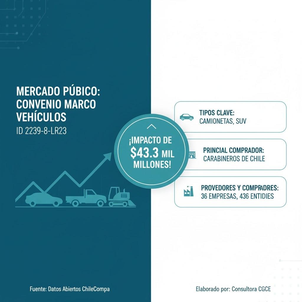 El presente informe ha sido elaborado por la Consultora CGCE con el objetivo de analizar y evaluar el desempeño comercial del Convenio Marco de Vehículos ID 2239-8-LR23 en el sistema de Mercado Público. Toda la información presentada y analizada en este documento proviene directamente de la plataforma oficial de Datos Abiertos de ChileCompra, garantizando la transparencia y la fidelidad de las cifras.