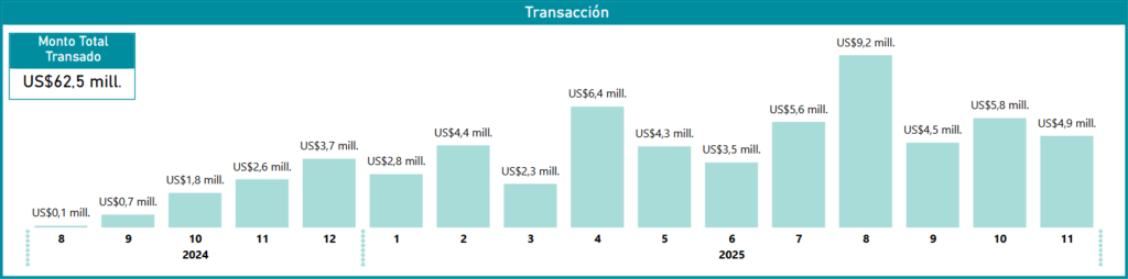 Hacia el final del periodo analizado, el volumen de transacciones ha mantenido una base sólida, promediando sobre los US$5 millones en el último trimestre reportado. Aunque después del peak de agosto hubo una estabilización, noviembre de 2025 cerró con US$4,9 millones, acumulando un monto total transado de US$62,5 millones en los 16 meses de operación. Esta cifra acumulada posiciona al convenio como una herramienta estratégica para la transformación digital del Estado, mostrando una tendencia que, si bien es fluctuante, mantiene niveles de inversión muy superiores a los registrados en su etapa de lanzamiento.