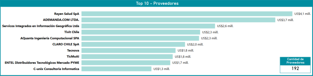 La participación de 192 proveedores es un indicador de la salud del ecosistema, especialmente considerando que el 75% de los adjudicados son Pymes. Si bien el «Top 10» concentra una parte relevante del presupuesto con empresas como AQuanta (US$2,3 millones), Tecnova (US$1,8 millones), TicMoAI (US$1,8 millones) y C-unix (US$1,3 millones), existe una base de más de 180 empresas que aseguran competitividad en nichos específicos como UI/UX, Ciberseguridad o QA. Esta distribución permite que el Estado cuente con una capilaridad de proveedores capaz de responder tanto a grandes licitaciones de desarrollo como a consultorías técnicas de menor escala, garantizando pluralidad en la oferta tecnológica.