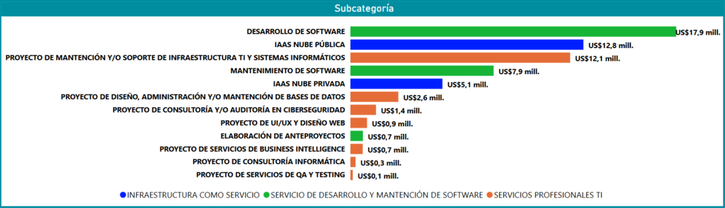 Finalmente, el segmento de servicios profesionales destaca por su enfoque en la continuidad operativa y la calidad. Los Proyectos de Mantención y/o Soporte de Infraestructura TI se posicionan como la tercera subcategoría con mayor volumen, transando US$12,1 millones. El resto del presupuesto se distribuye en nichos críticos como: