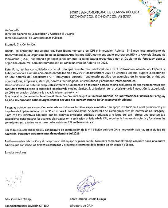 La Dirección Nacional de Contrataciones Públicas (DNCP) se enorgullece en anunciar que la candidatura presentada por el Gobierno del Paraguay ha sido seleccionada para la organización de la VIII Edición del Foro Interamericano de Compra Pública de Innovación CPI e innovación abierta, la misma se llevará a cabo los días 4, 5 y 6 del mes de noviembre en el Centro de Convenciones del Banco Central del Paraguay del presente año en la ciudad de Asunción, con el apoyo del Banco Interamericano de Desarrollo (BID), de la Organización de los Estados Americanos (OEA) y la Axencia Galega de Innovación (GAIN).
