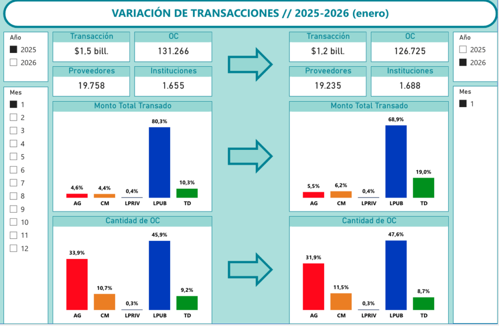 El inicio de este 2026 nos entrega una radiografía clara, aunque desafiante, del mercado de compras públicas en comparación con el mismo periodo del año anterior. Al analizar las cifras de enero, se observa una contracción del 20% en el monto total transado, pasando de $1,5 billones en 2025 a $1,2 billones en 2026. Esta baja no es aislada; viene acompañada de un ligero descenso en la cantidad de órdenes de compra (OC) y una disminución en la base de proveedores activos.
