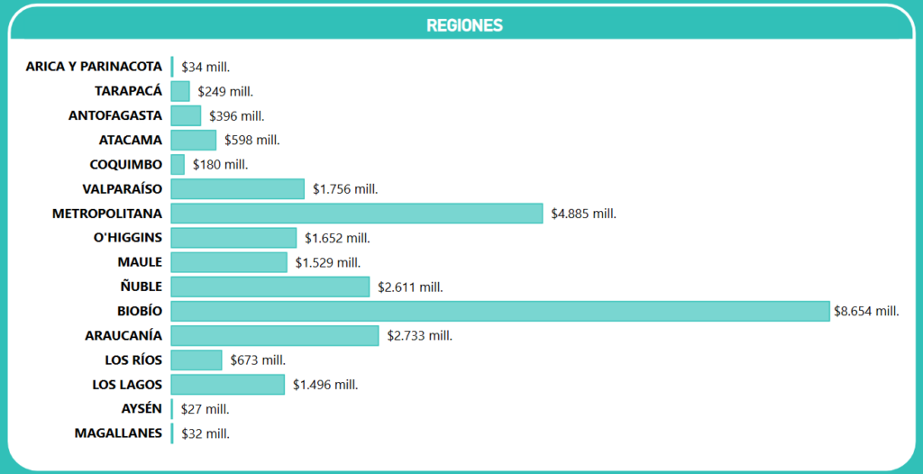 - Región del Biobío: Lidera el gasto nacional con un 31,5% de participación ($8.654 millones). Este volumen histórico se debe principalmente a las catástrofes ocurridas durante el verano de 2026, que exigieron un despliegue masivo de recursos de emergencia.