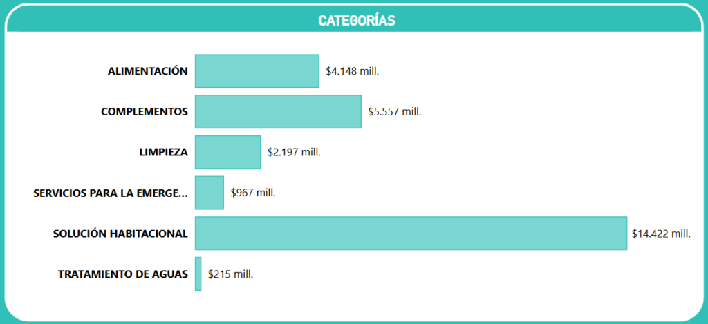 - Alimentación: Representa el 15,1% del total, con una inversión de $4.148 millones. Esta categoría es vital para la entrega de kits de víveres y raciones de emergencia en las primeras horas del evento.