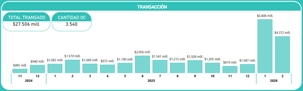 El comportamiento comercial del Convenio Marco para Emergencias y Prevención (ID 2239-8-LR24) presenta una dinámica marcadamente reactiva, donde el volumen de transacciones está directamente vinculado a la ocurrencia de eventos críticos y catástrofes a nivel nacional. Durante el periodo analizado, que comprende desde noviembre de 2024 hasta febrero de 2026, el convenio ha canalizado un monto total transado de $27.506 millones, distribuidos en 3.540 Órdenes de Compra (OC).