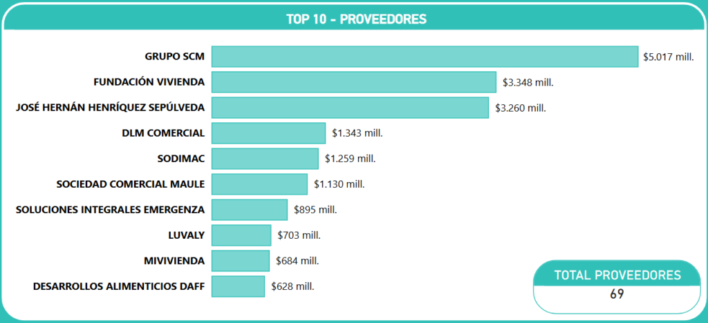 - Sector Habitacional: La Fundación Vivienda ($3.348 millones) y José Hernán Henríquez Sepúlveda ($3.260 millones) ocupan el segundo y tercer lugar respectivamente. Juntos, representan el 24% del mercado total, lo que subraya la relevancia de las soluciones de vivienda de emergencia.