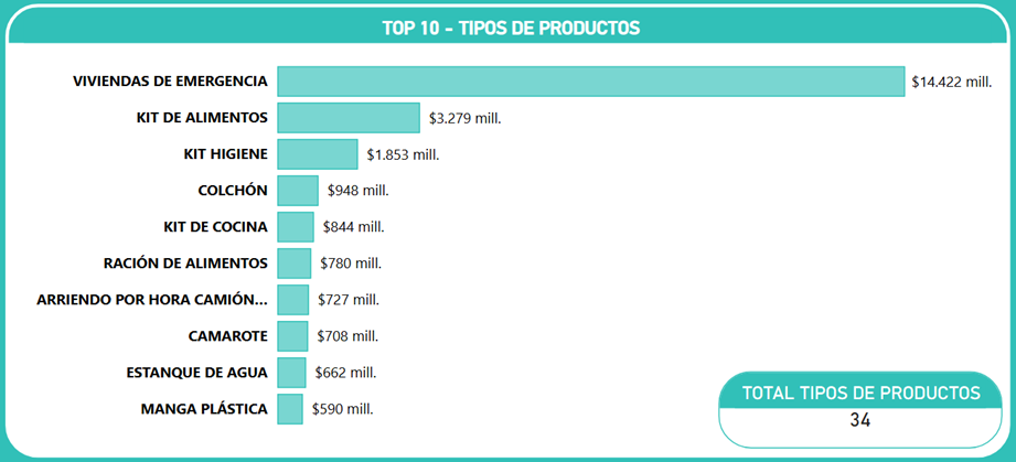 - Solución Habitacional: Es la categoría predominante con una participación del 52,4% del mercado, totalizando $14.422 millones. Este liderazgo absoluto se explica por la necesidad de proveer viviendas de emergencia (mediaguas o módulos de alto estándar) de forma inmediata tras las catástrofes.