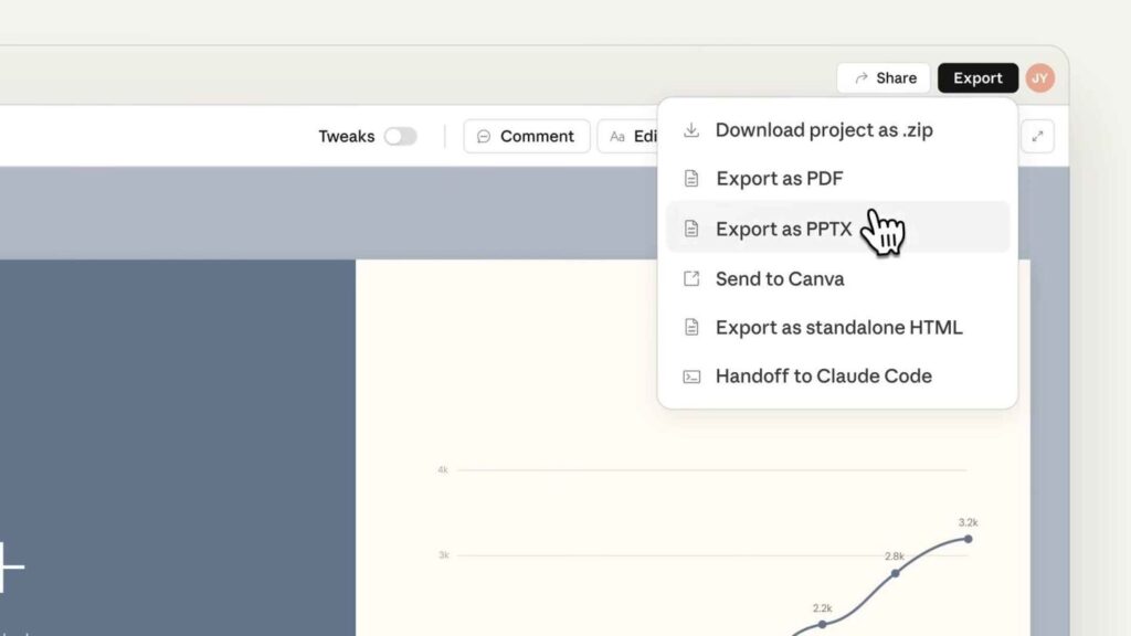 Cuando el diseño está listo, Claude Design puede exportarlo a Canva, PDF, PPTX o HTML. En caso de que quieras enviarlo a producción, la IA genera un paquete de handoff que puedes entregarle directamente a Claude Code.