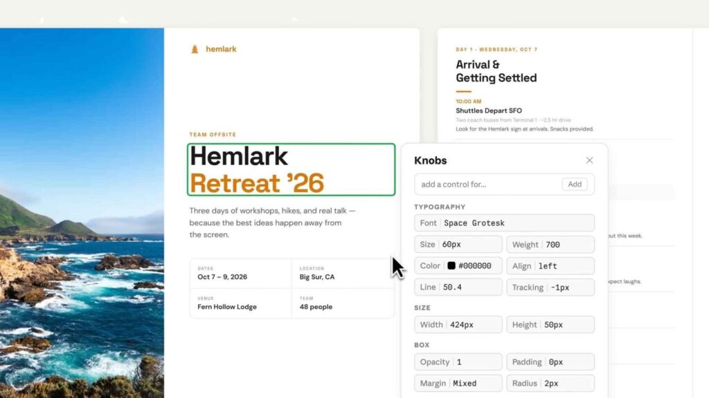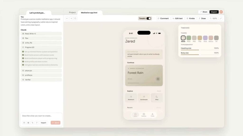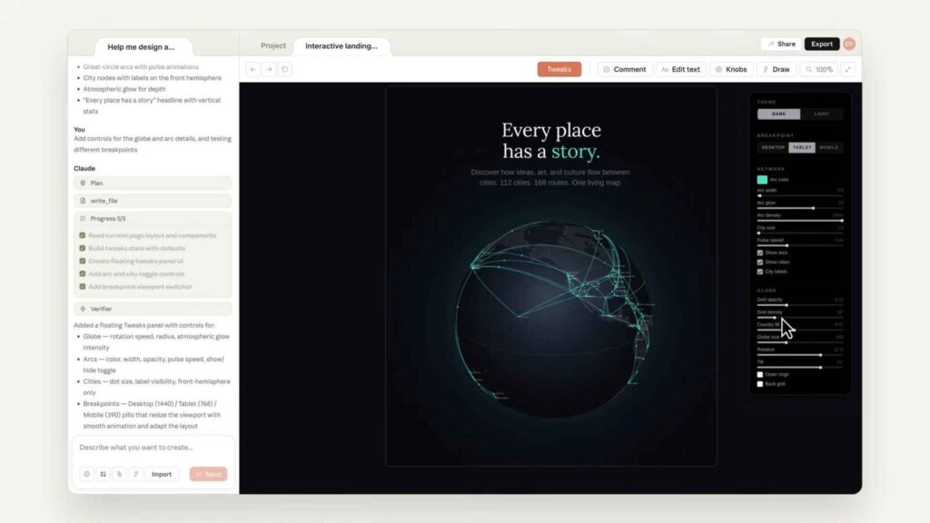 Según Anthropic, Claude Design es un colaborador de diseño conversacional. Solo describe lo que quieres, espera a que Claude genere una primera versión y de ahí vas refinando. Puedes comentar directamente sobre elementos del diseño, editar texto en el lugar o usar controles deslizantes que el propio Claude crea para ajustar cosas como el espaciado, el color o la disposición, todo en tiempo real.