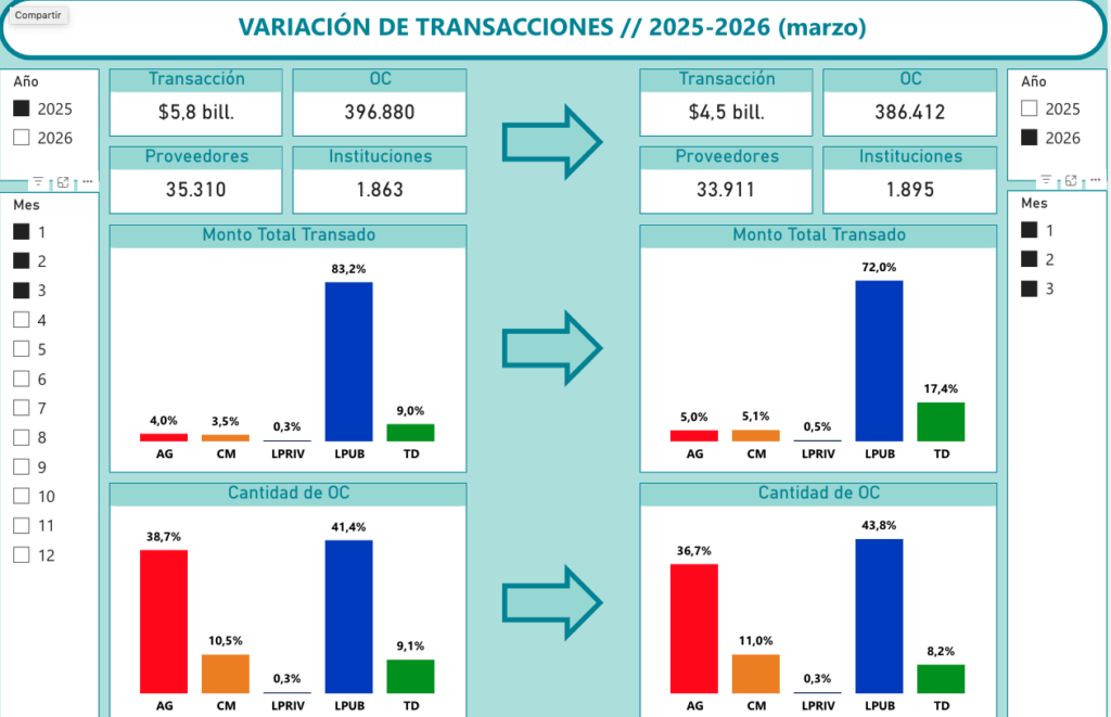 Lo primero que salta a la vista es una contracción estrepitosa: el monto transado cayó un 22,4%, pasando de $5,8 billones a $4,5 billones en comparación con 2025. Pero lo alarmante no es que se gaste menos ,la austeridad podría ser una virtud, sino que en este proceso hemos perdido a 1.399 proveedores.