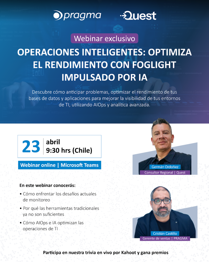En un contexto donde la calidad y disponibilidad de los datos son clave para la toma de decisiones, PRAGMA y Quest Software realizarán el próximo 23 de abril a las 9:30 hrs (Chile) el Webinar “Operaciones inteligentes: optimiza el rendimiento con Foglight impulsado por IA”, dirigido a profesionales TI que buscan mejorar la eficiencia y visibilidad de sus entornos tecnológicos.