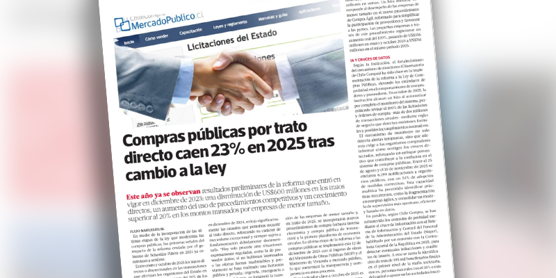 Revista Digital – Información de Mercados – Compra Pública Latam. En 2025 ya se observan resultados preliminares de la reforma, con una disminución de 23% en los Tratos Directos, un aumento del uso de procedimientos competitivos hasta 86,5% y un crecimiento superior al 20% en los montos transados por Empresas de Menor Tamaño. Este viernes 26 de […]